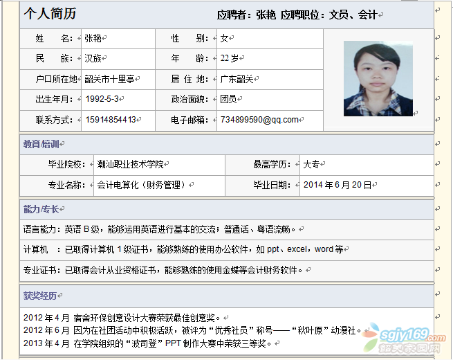 正文摘要:已經(jīng)取得會計從業(yè)資格證書,但是在從事會計工作方面的經(jīng)驗暫無,之前2013年9月-2014年7月在韶關(guān)市同樂網(wǎng)游代練服務(wù)部從事過文員、銷售、客服的工作。我希望能找到符合專業(yè)的工作,希望能有培訓的機會。希望工作有國 ... |