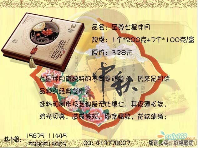 正文摘要:本帖最后由 Rachel 于 2014-9-4 09:17 編輯 萊斯七星伴月,月餅中的勞斯萊斯 五星品質,五星享受,是您送禮的最佳選擇! 最后23盒,售完即止,員工價優(yōu)惠全城,快快來電吧! |